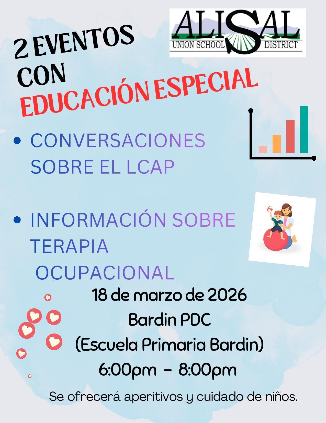 El Departamento de Educación Especial ofrecerá un taller para padres el Plan de Control y Responsabilidad Local. Este plan, que también se llama LCAP, se renueva cada año y nos ayuda a guiar los servicios que se dan a los estudiantes.